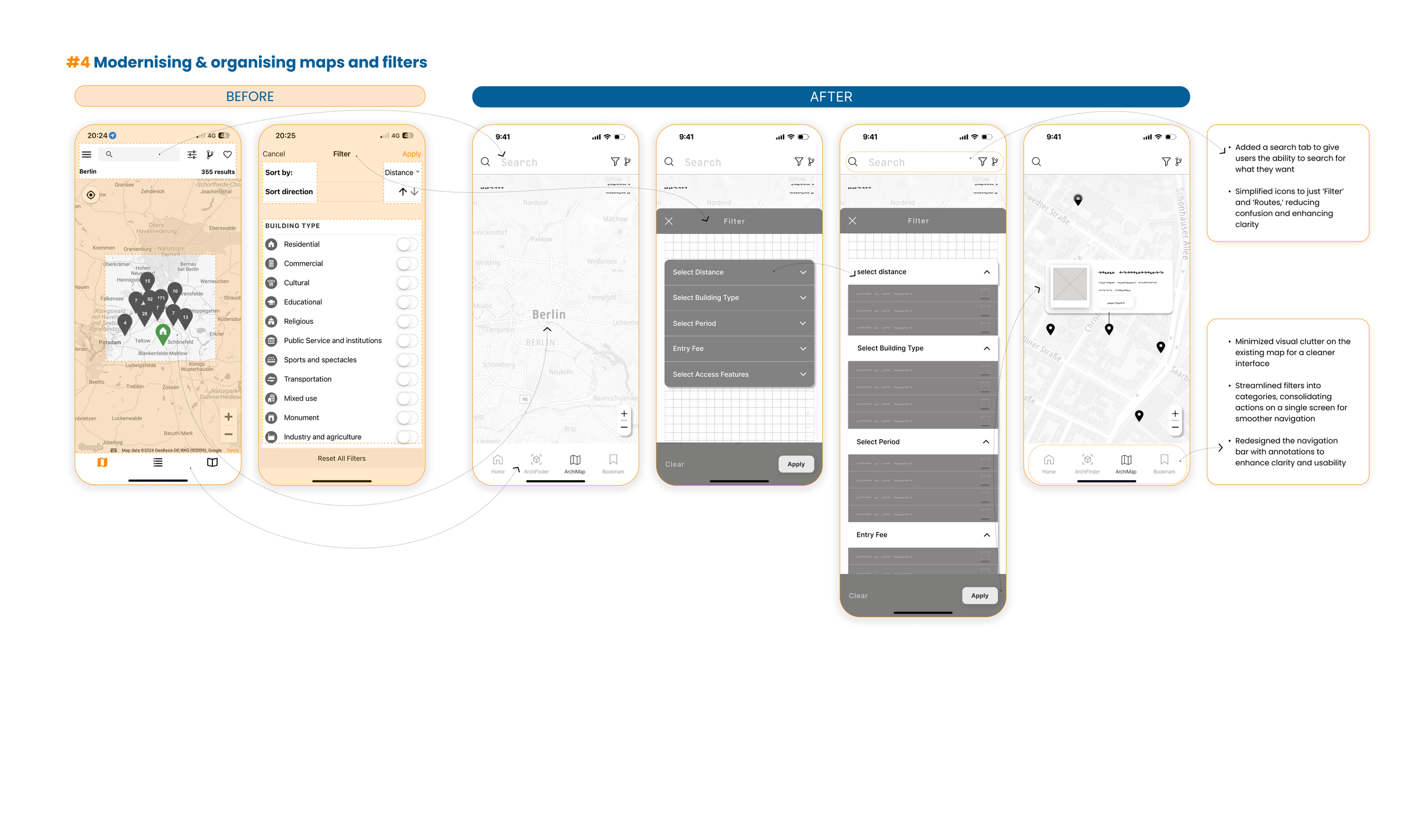 Maps: The original app’s map was cluttered, making it difficult for users to interpret information. To address this, I simplified the map, ensuring it remains minimal and displays information only when users input specific search criteria. In the future, I plan to enhance the map by adding notifications for buildings or places of architectural significance when users of the app walk past them.
